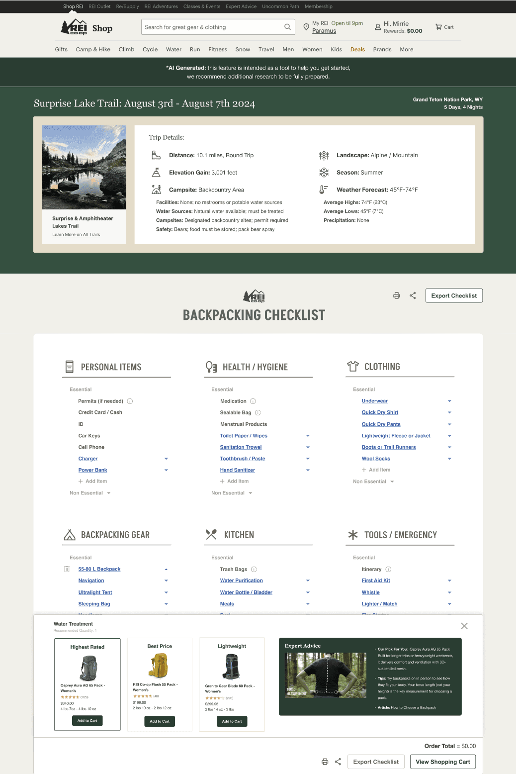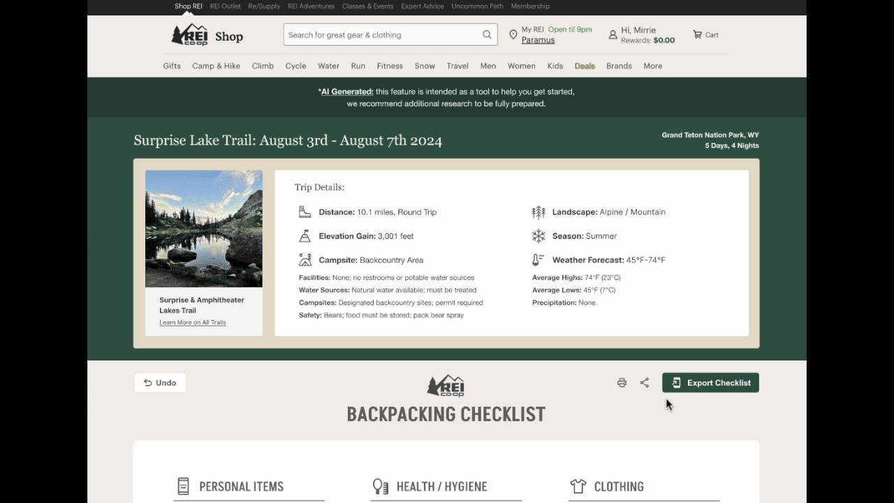 Use AI to leverage the strengths of REI’s existing resources to create custom checklists for backpackers