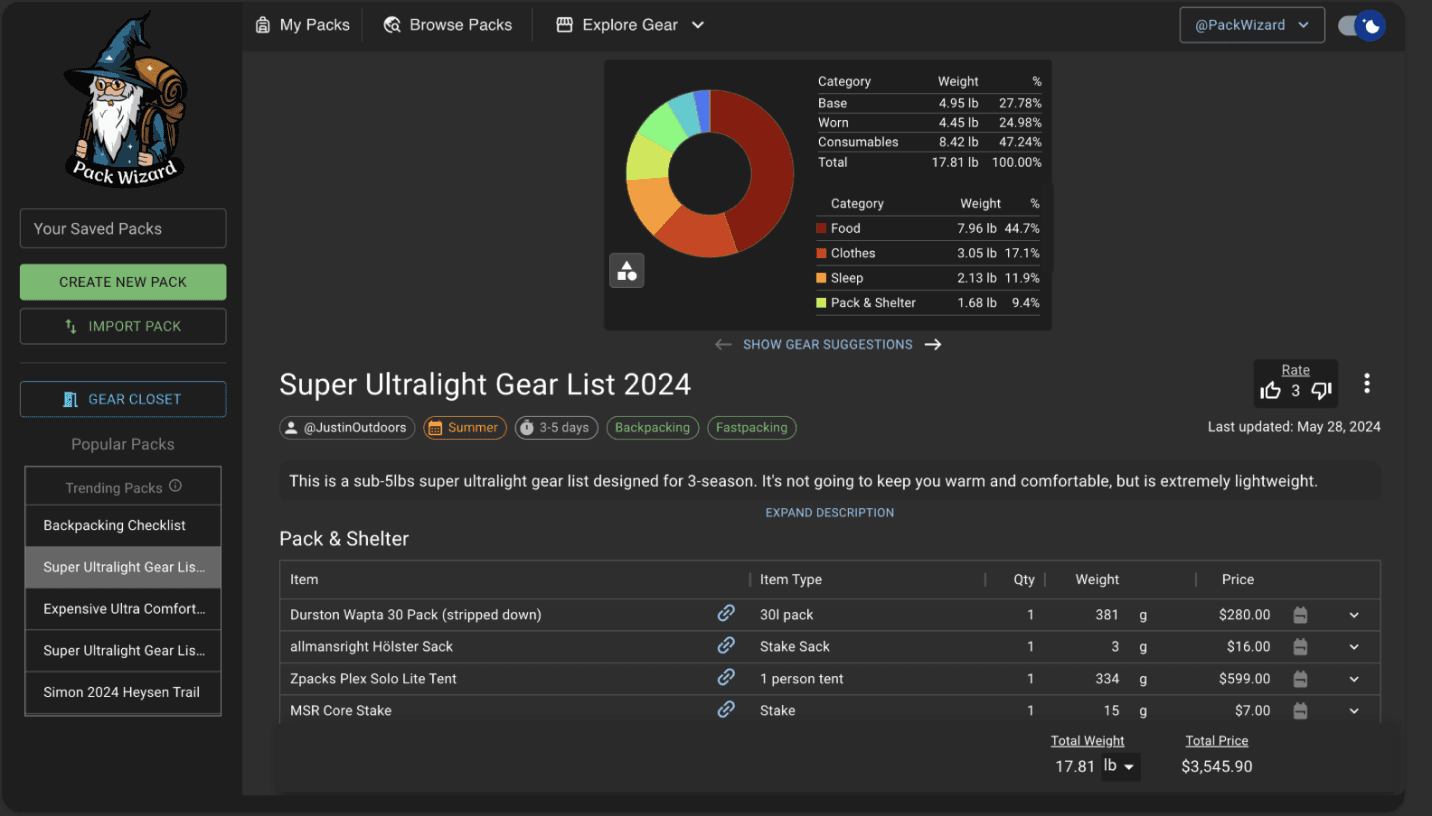 Backpackers want an easy way to determine what to pack and purchase for their trips based on factors such as price, weight, weather, location and duration of the trip.