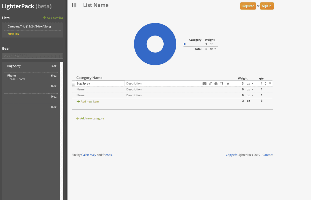 LighterPack: users have to upload all the products & specifications (like weight) themselves one by one