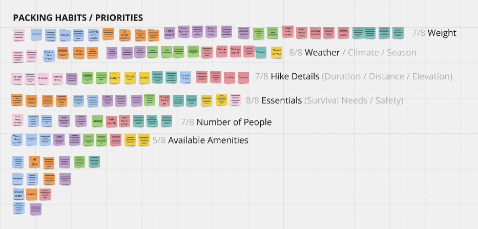 Affinity mapping revealed themes such as the factors most important to backpackers when preparing for a trip.