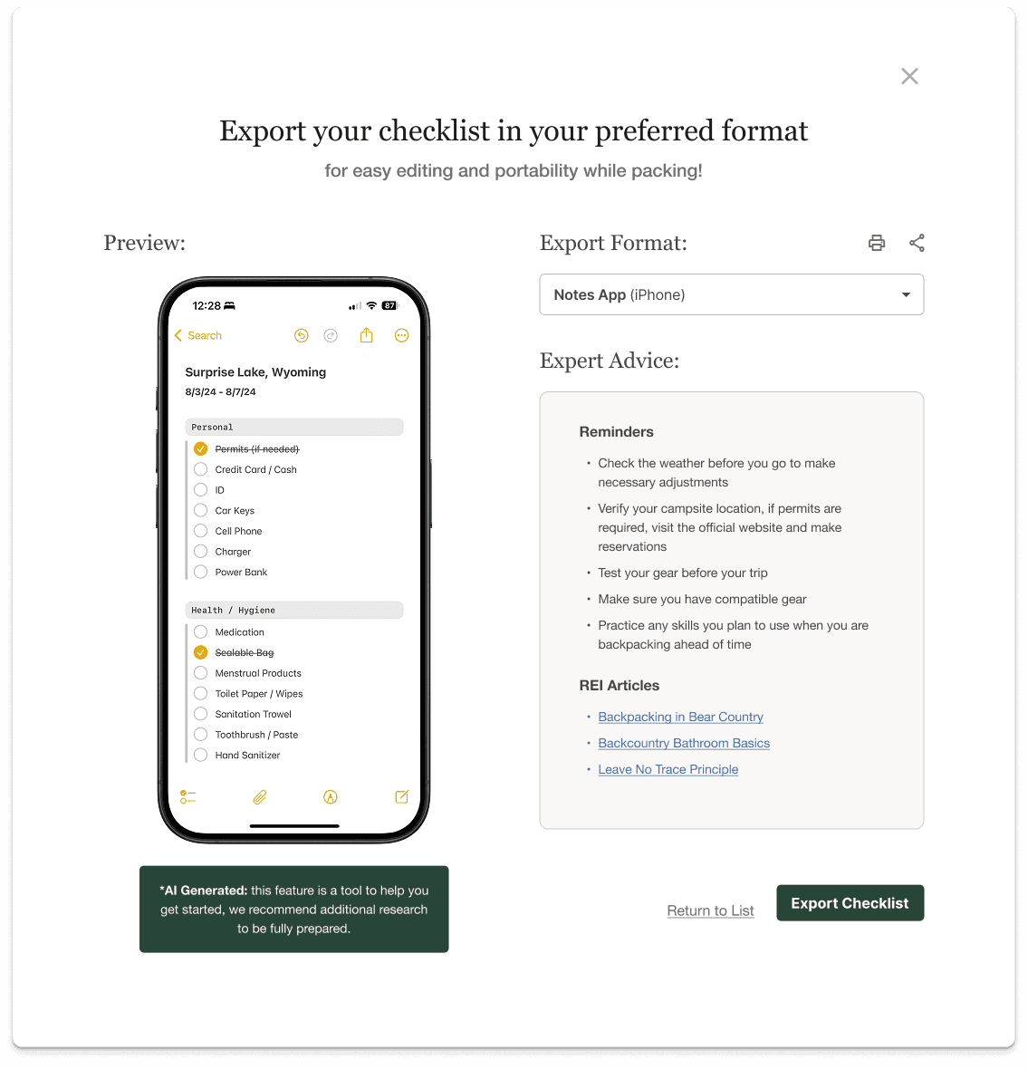 An AI feature that generates personalized packing lists for users based on their unique trip details and needs. This feature helps guide users through all the steps needed to prepare in one fun, easy to navigate and digest experience.