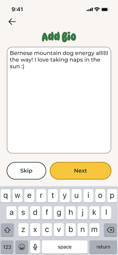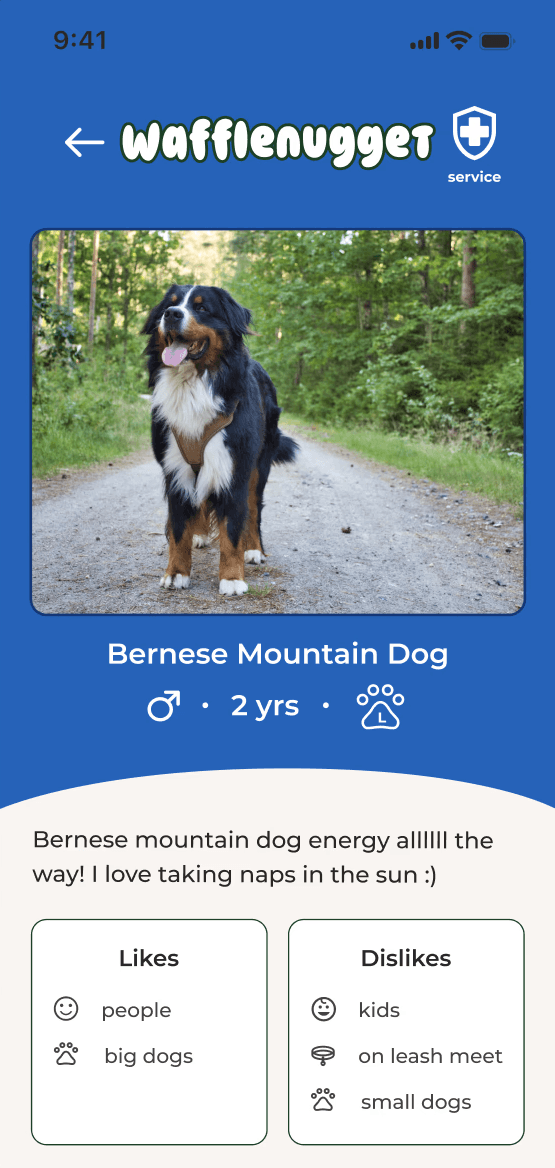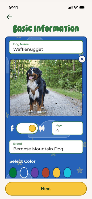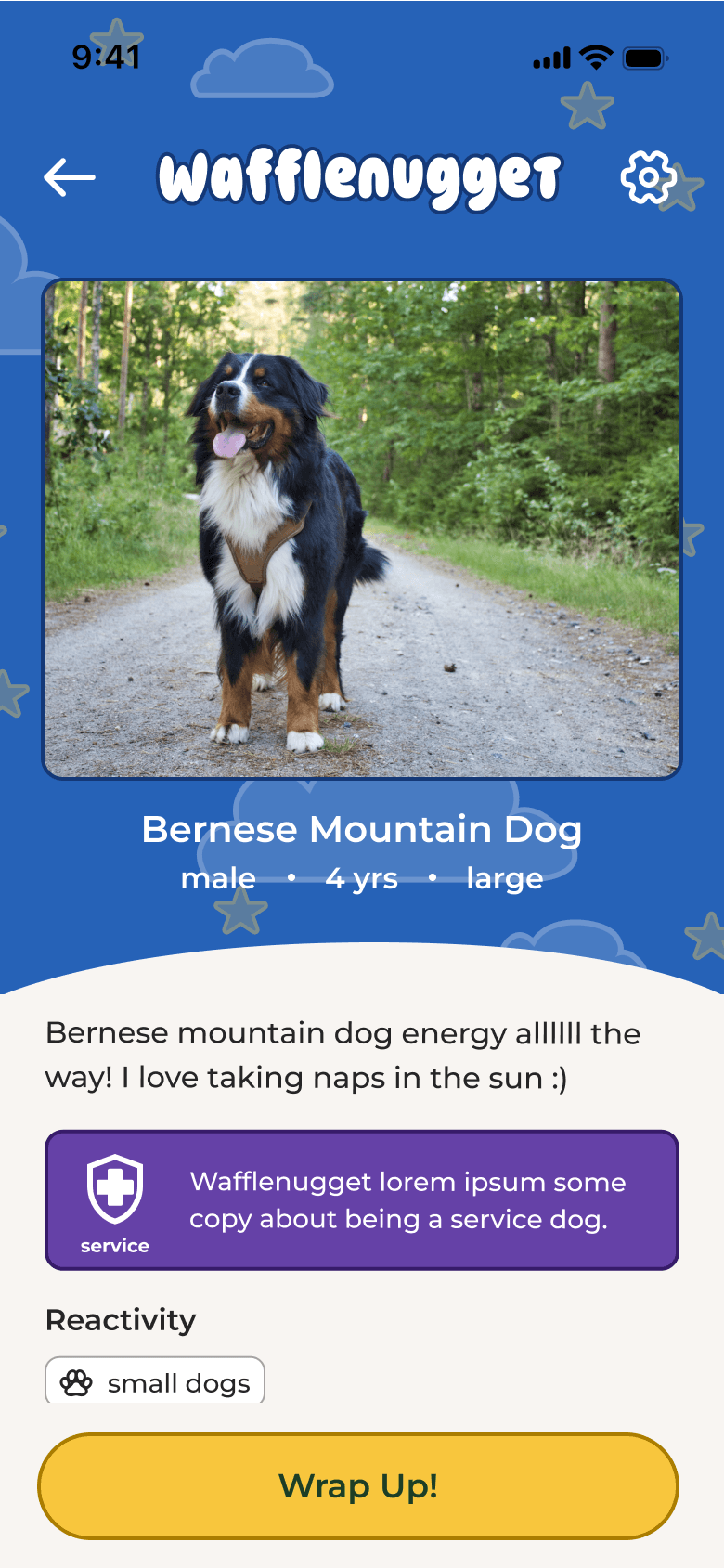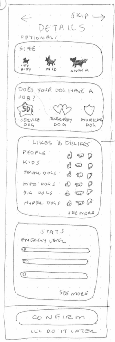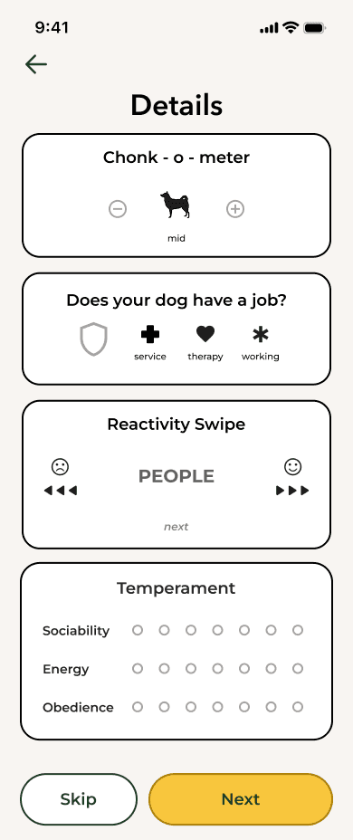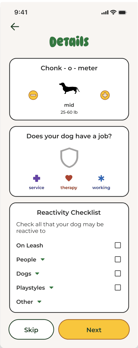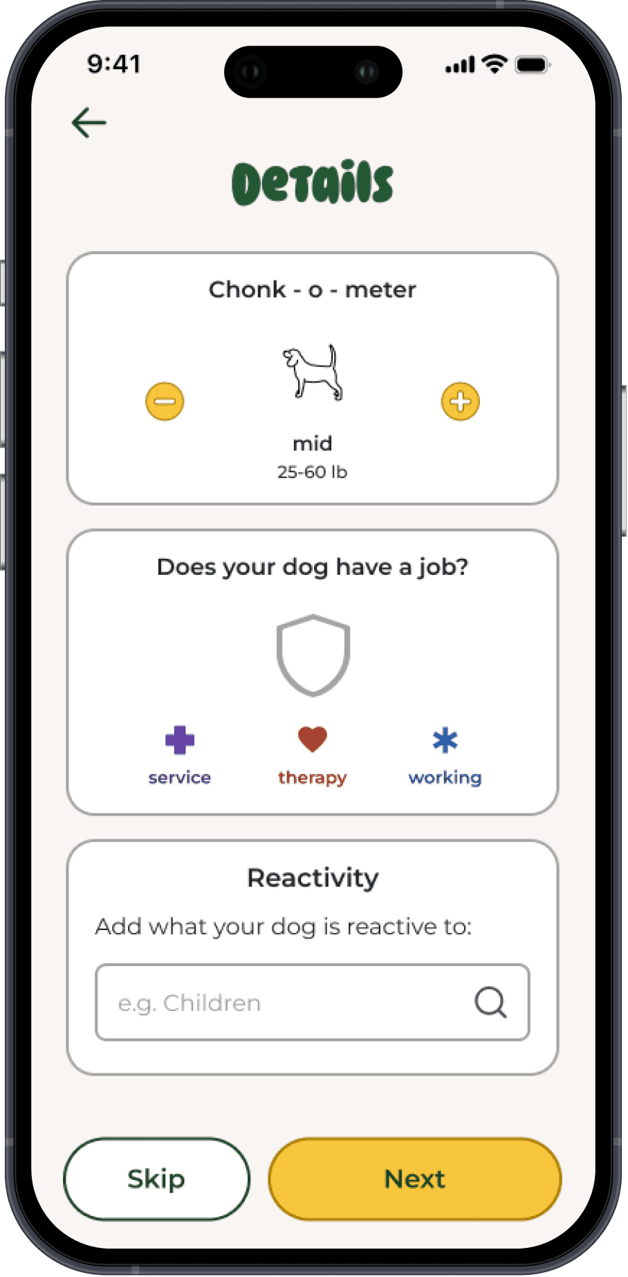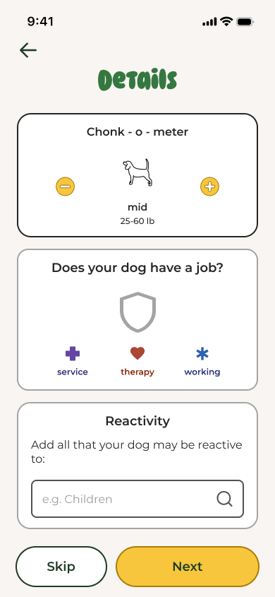 A “Details Screen” was added to the existing dog profile flow to incorporate size, dog job and reactivity information in a fun and engaging way. The dog profile was also updated to reflect the additional information.